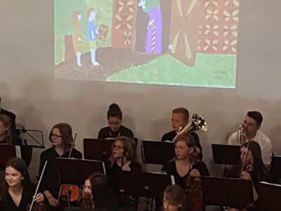 Unterstützt durch Schülerarbeiten, die einzelne Szenen des Märchens zeigten und per Beamer über die Bühne projeziert wurden, sang der Schulchor begleitet vom Schülerorchester die bekanntesten Lieder.