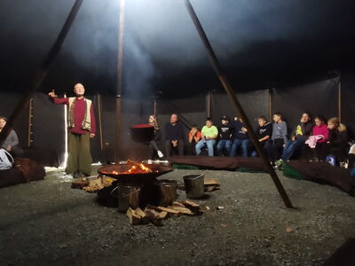 Dort angekommen versammelten sie sich in der Dunkelheit des Zeltes um ein knisterndes Lagerfeuer und lauschten gespannt dem Erzähler Matthias. Dieser gab das Märchen eines besonders geschickten Diebes, welcher es auf ein wunderschönes Pferd mit Glocken abgesehen hatte, zum Besten.