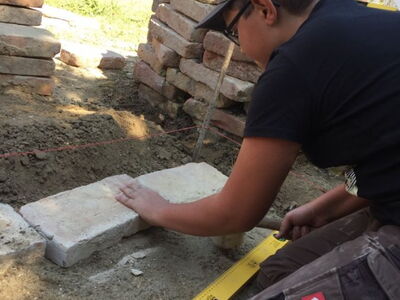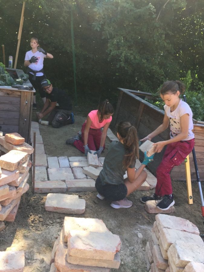 Die Schülergruppe der 5. Klasse durften am Mittwoch (17.07.2019) einen Weg im Schulgarten zwischen den Hochbeeten pflastern.