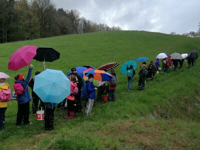 Ausgestattet mit Gummistiefeln, Matschhosen, Gartenhandschuhen, kleinen Eimern und Schaufeln ging es zu Fuß über Wiesen und durch den Wald Richtung Weingarten. Dort angekommen durften sich die Kinder zunächst mit ihrer mitgebrachten Brotzeit stärken. Im Anschluss wurden in Kleingruppen und mit Unterstützung von weiteren OGV- Helfern drei Kartoffeltürme mit Hilfe von Holzlatten, Maschendraht, Stroh, Erde und Pferdemist gebaut.