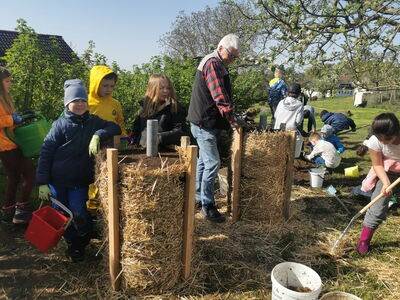 Die Kinder siebten zuerst die Erde, um dann aus Pflöcken und Draht ein Rondell zu bauen, in das abwechselnd Erde, Pferdemist und Saatkartoffeln geschichtet wurden. Direkt am Draht dient Stroh als Abdichtung.