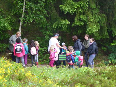 Leider meinte es der Wettergott nicht gut mit den Klassen 1a und 1b, als sie sich am Pfahl bei Viechtach die Wiesenblumen und Wiesentiere genauer anschauen wollten. Pünktlich nach dem Märchen über die Entstehung des Pfahls, begann es zu regnen und es sollte drei Stunden lang nicht mehr aufhören. Das tat der Stimmung aber keinen Abbruch. Die Kräuterexpertinnen Erika und Evi spielten mit den Kindern, ließen sie Fichtennadeln und Honig kosten, machten Wettbewerbe und ließen Quarzsteine mit Hirtentäschelblättern in Wasserbechern schwimmen.