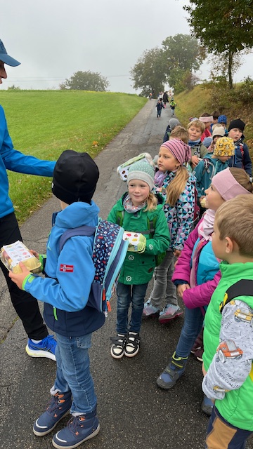 Auch wenn es kein goldener Oktobertag war, trotzdem machten sich die Kinder der Klassen 1a und 1b gemeinsam auf, um an ihrem 1. Wandertag Herbstschätze zu sammeln. Auf ihrem Weg entdeckten sie Kastanien, Federn, bunte Blätter, tolle Steine, Tannenzweige, Zapfen und noch vieles mehr. Rasch waren die Eierkartons gefüllt und nach einem ausgiebigen Picknick war noch reichlich Zeit, um im Wald zu spielen.