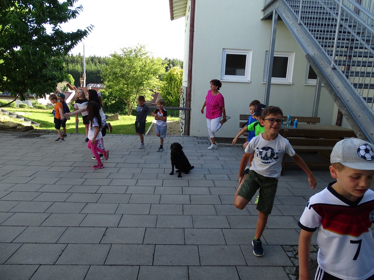Welch eine Freude, als alle Kinder der Klassen 1 und 2 sich zum Aufwärmen versammelten, denn heute sollte ihr Tag werden. Waren auch die Trainingsergebnisse der zurückliegenden Wochen überschaubar, so wollte es sich niemand nehmen lassen, an den Start zu gehen. Die Aufgabe lautete: Laufe 15 Minuten oder 30 Minuten, ohne dazwischen anzuhalten. Einen rieseigen Motivationsschub bekamen die Schülerinnen und Schüler natürlich durch den Schulhund Akasha, der zusammen mit Frau Hausladen die Vorhut bildete und erstmal das Tempo vorgab. "Niemand überholt!", so lautete die Devise. Und wie groß war die Überraschung, als nach 30 gelaufenen Minuten die Kinder den Countdown zum Aufhören vernahmen. Mehr als dreiviertel aller Teilnehmer schafften die 30-Minuten-Vorgabe und niemand gab auf, bevor man die 15-Minuten-Zeitmarke passiert hatte. Die begeisterten Lehrerinnen, die die Rolle des Anfeuerns übernommen hatten, schauten in zahlreiche ungläubige Gesichter, denn so schnell war es nicht jedem klar, dass man das Ziel erreicht hatte. Als Anerkennung gab es nicht nur eine Urkunde, sondern an diesem Tag auch keine Hausaufgaben! Der Wettbewerb "Lauf dich fit" war für alle ein sportliches Highlight.