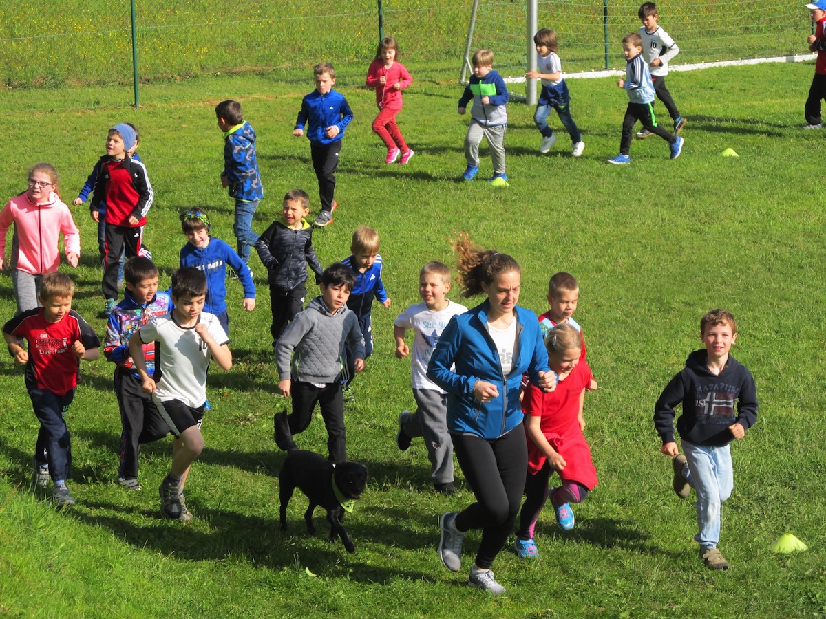 Einen besseren Motivator für „Lauf dich fit!“ hätten die Schülerinnen und Schüler der ersten und zweiten Jahrgangsstufen der Grundschule Haselbach nicht bekommen können, als den Schulhund von Veronika Hausladen. Akasha trabte Runde um Runde, immer die Kinder im Rücken, aber mit der Gewissheit, dass alle vom Scheitel bis zur Fußsohle angespannt sind, um zusammen mit der Hündin den 15- oder 30-minütigen Ausdauerlauf zu schaffen. Aber es gab noch mehr action. "Who let the dogs out?" schallte es aus dem Lautsprecher und die anwesenden Lehrerinnen und Lehrer feuerten vom Lauffeldrand aus die jungen Sportlerinnen und Sportler, zusammen mit einigen Schülermüttern, lautstark an.