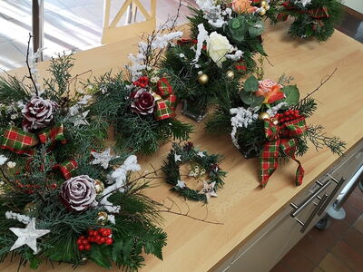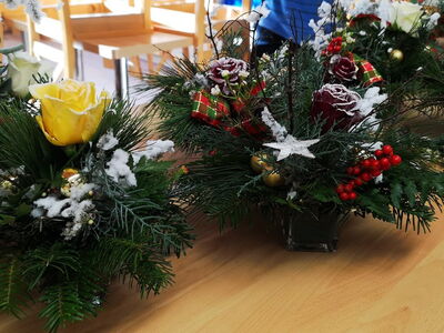 Am Mittwoch, den 11. Dezember war Frau Lindl vom Blumenladen „Quer durch`s Beet“ zu Gast bei der Gruppe „Soziales“ der 9. Klassen. Zuerst zeigte Frau Lindl das Binden eines Weihnachtsstraußes vor. Anschließend breitete sie einen Korb Naturmaterialien aus, mit denen die Schülerinnnen und Schüler stimmungsvolle Weihnachtsgestecke herstellten. Dabei ließ jeder unter Anleitung von Frau Lindl die eigene Kreativität spielen. Für die Herstellung einer Tischkarte wurden die Reste der Naturmaterialien zu einem Kränzchen verarbeitet, auf dem ein Stern als Namensschild angebracht wurde.