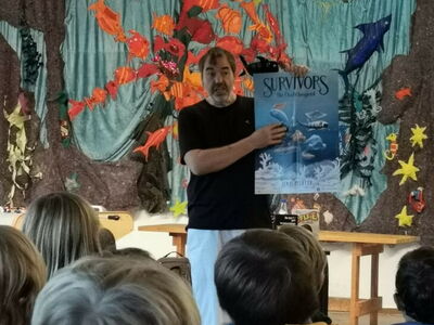 Der Schriftsteller wurde voller Freude empfangen und erzählte anfangs von seinem Werdegang, beantwortete die unzähligen Fragen der faszinierten Kinder über das Autorenleben im Allgemeinen, Schreibmotivation, sprach offen über seinen Verdienst und lachte mit ihnen über die ein oder andere Szene aus einem seiner Bücher. Sein neustes Kinderbuch ,,Survivors‘‘, welches von einer witzig-chaotischen Fisch-Crew handelt, stellte der Autor kurz vor und betrachtete hoch erfreut das gigantische Unterwasser-Wandbild der Schule, welches hervorragend zu seinem Buch-Cover passte. Im Anschluss gab er eine spannende Kostprobe aus dem neuesten ,,???-Buch‘‘ welches seiner Feder entsprang. Die Zuhörer lauschten dieser sichtlich angetan und löcherten den Vorleser im Anschluss erneut mit Anregungen, Fragen und Ideen über den Verlauf und die Charaktere der Geschichte.