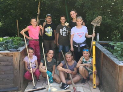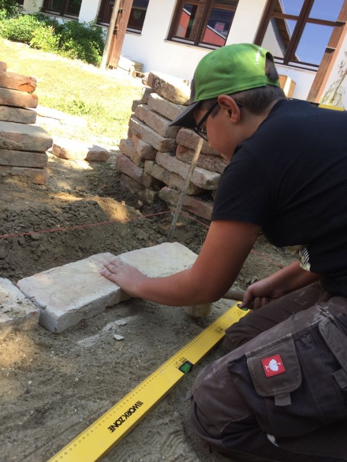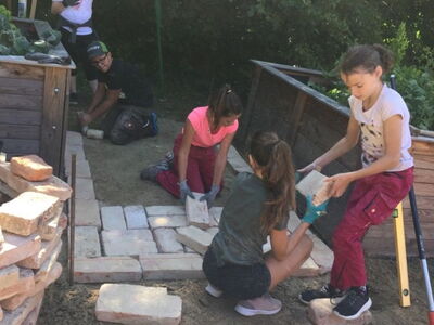Die Schülergruppe der 5. Klasse durften am Mittwoch (17.07.2019) einen Weg im Schulgarten zwischen den Hochbeeten pflastern.
