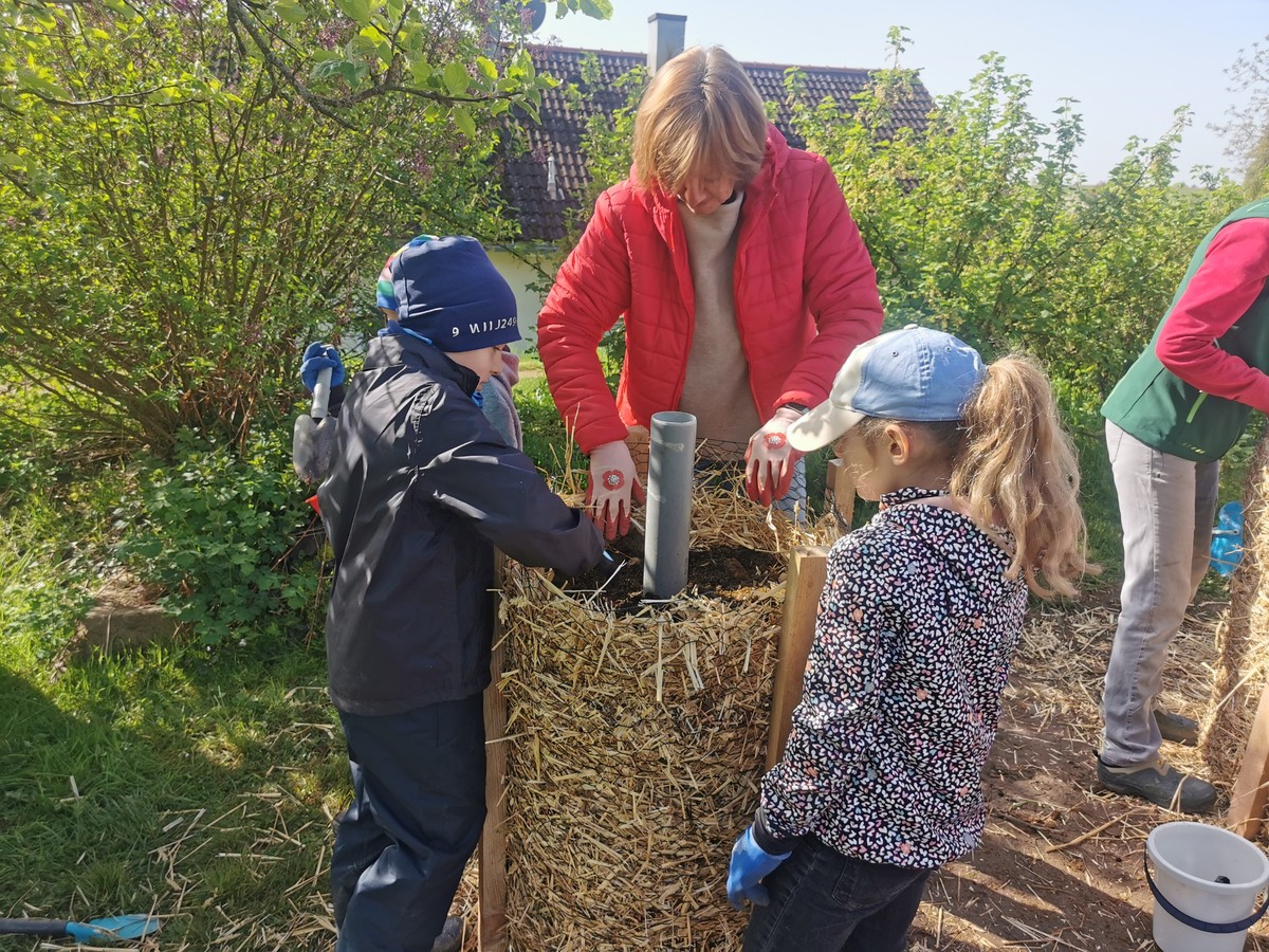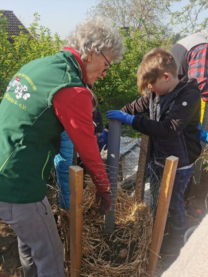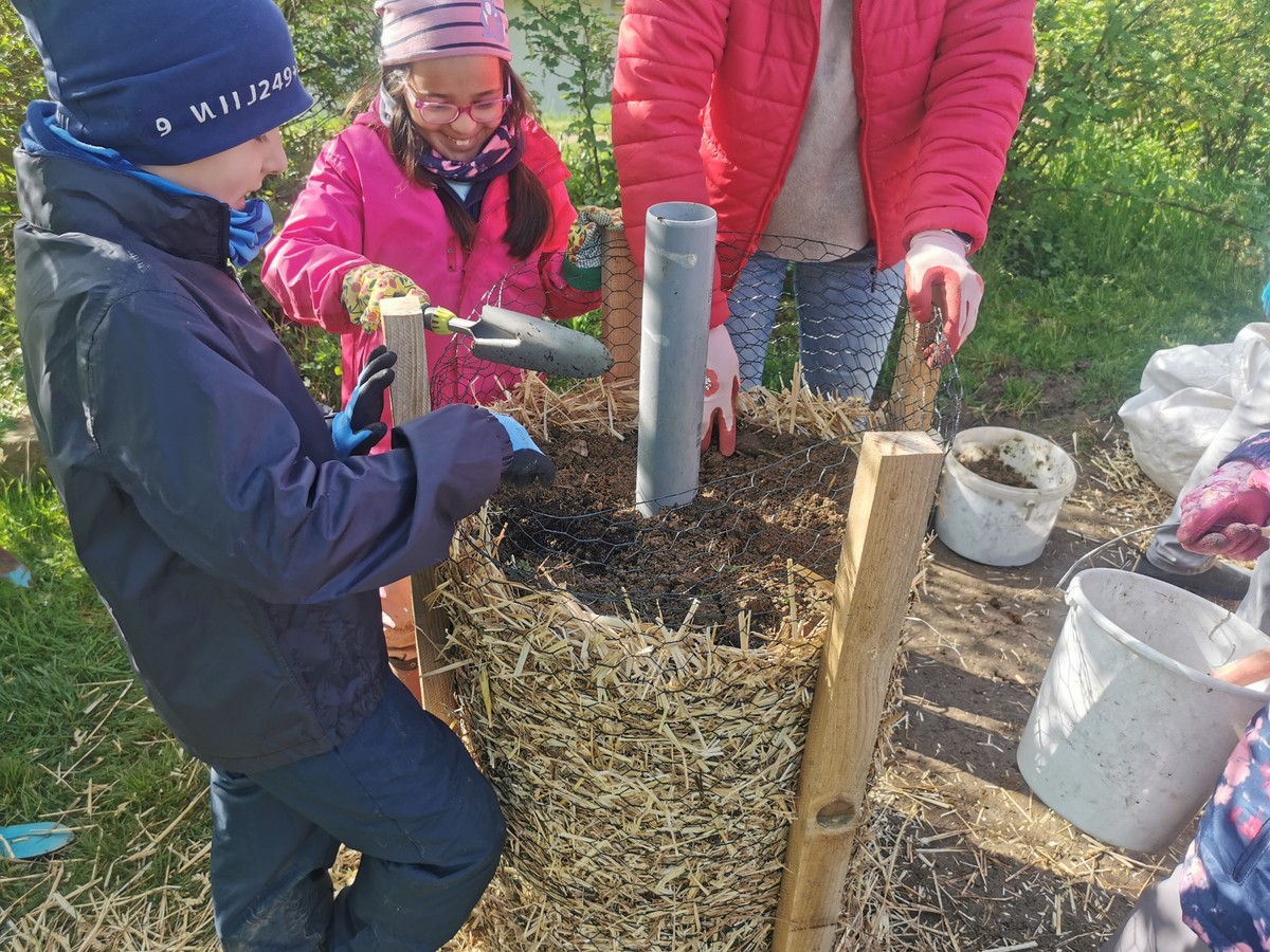 Die Kinder siebten zuerst die Erde, um dann aus Pflöcken und Draht ein Rondell zu bauen, in das abwechselnd Erde, Pferdemist und Saatkartoffeln geschichtet wurden. Direkt am Draht dient Stroh als Abdichtung.