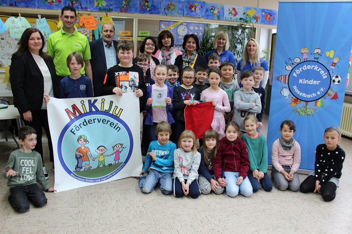 Bild: Die Schüler der Klasse 2a bei der Spendenübergabe: Rektorin Bianca Luczak (links) und die Lehrerinnen der Grundschule Mitterfels-Haselbach Tatjana Steininger-Nelz, Claudia Bach-Jobst und Birgit Fuchshuber (4.,5. und 6. v. links) freuen sich in Anwesenheit von Johann Sykora (1. Bürgermeisters der Gemeinde Haselbach, 3. v. links) über die Spende des Mitterfelser Kinder- und Jugendfördervereins (vertreten durch Andreas Liebl, 1. Vorsitzender, 2. v. links) sowie des Förderkreis Kinder Haselbach (vertreten durch Kerstin Zollner, rechts, und Nadine Liebl, 2. von rechts). Die Kinder präsentieren stolz die Urkunden und Turnbeutel.