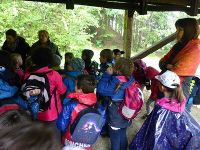 Leider meinte es der Wettergott nicht gut mit den Klassen 1a und 1b, als sie sich am Pfahl bei Viechtach die Wiesenblumen und Wiesentiere genauer anschauen wollten. Pünktlich nach dem Märchen über die Entstehung des Pfahls, begann es zu regnen und es sollte drei Stunden lang nicht mehr aufhören. Das tat der Stimmung aber keinen Abbruch. Die Kräuterexpertinnen Erika und Evi spielten mit den Kindern, ließen sie Fichtennadeln und Honig kosten, machten Wettbewerbe und ließen Quarzsteine mit Hirtentäschelblättern in Wasserbechern schwimmen.