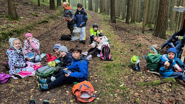 Auch wenn es kein goldener Oktobertag war, trotzdem machten sich die Kinder der Klassen 1a und 1b gemeinsam auf, um an ihrem 1. Wandertag Herbstschätze zu sammeln. Auf ihrem Weg entdeckten sie Kastanien, Federn, bunte Blätter, tolle Steine, Tannenzweige, Zapfen und noch vieles mehr. Rasch waren die Eierkartons gefüllt und nach einem ausgiebigen Picknick war noch reichlich Zeit, um im Wald zu spielen.