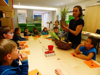 Da staunten die Kinder der Klassen 1a und 1b nicht schlecht, als ihnen Frau Plank vom Schaufenster des Nawareums erzählte, dass jeder Erwachsene pro Monat Lebensmittel im Wert von 16,35€ wegschmeißt. Sei es, weil sie verdorben sind, sei es, weil das Mindesthaltbarkeitsdatum abgelaufen ist oder weil man zuviel gekauft hat. Dass man besser nur so viel einkauft und vorbereitet, wie dann tatsächlich gegessen wird erfuhren die Kinder an dem einfachen Beispiel der Kartoffel. 200 Gramm pro Portion berechnet man, die dann auch verzehrt werden soll. Gemeinsam aßen sie einen Quark mit heimischen Erdbeeren, eine Scheibe Baguette mit selbst gemachter Kräuterbutter und zum Nachtisch ein Stückchen Bananenkuchen. Als Erinnerung gab es einen hölzernen Kochlöffel und das Rezept für den Kuchen. Anschließend spazierten die Klassen noch über den Straubinger Stadtplatz, erfuhren Interessantes über den Stadtturm, die Steinergasse, den Bruder Straubinger und machten Halt vor besonders schönen Straubinger Bürgerhäusern.