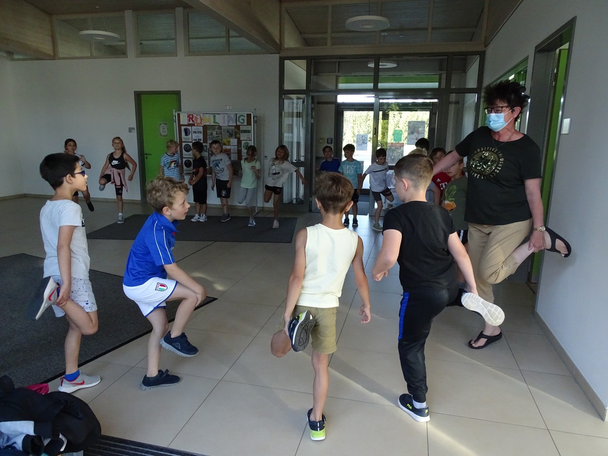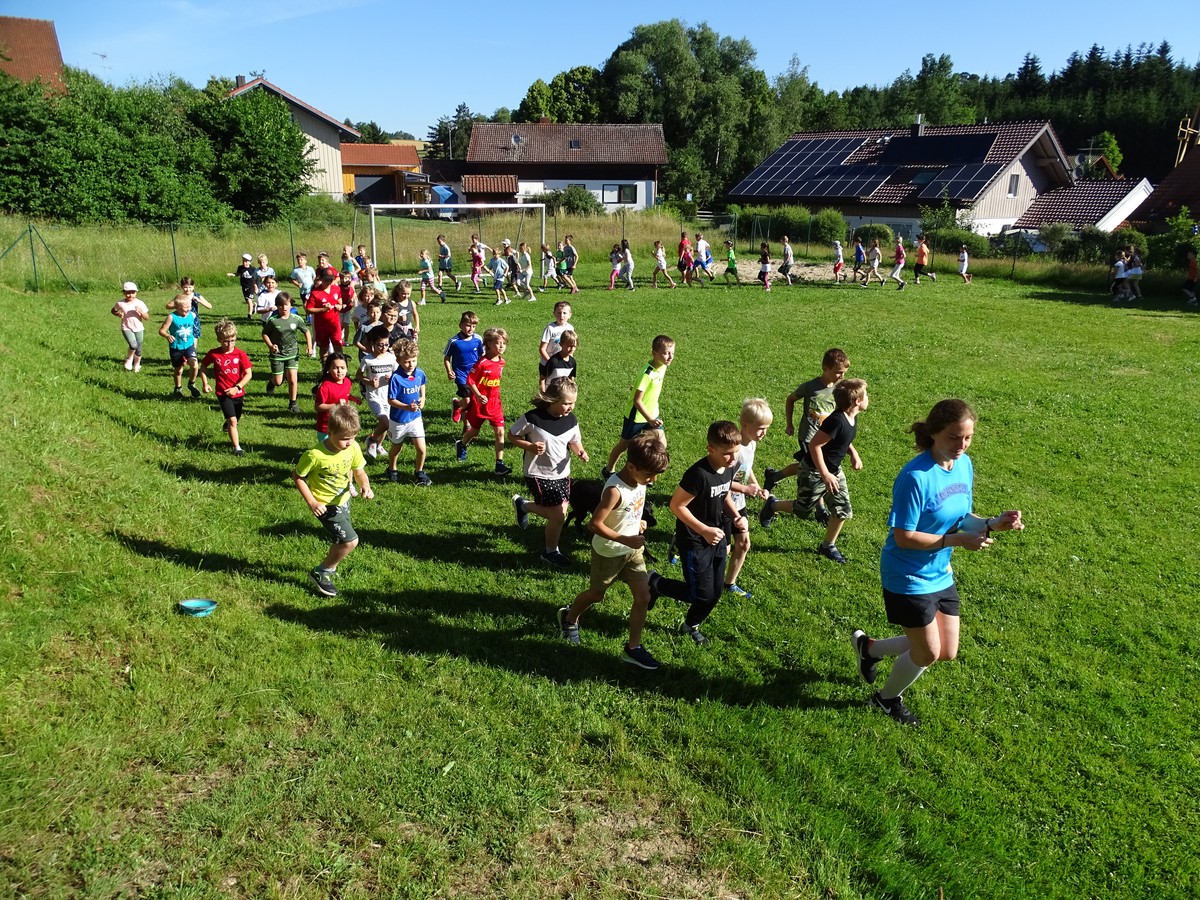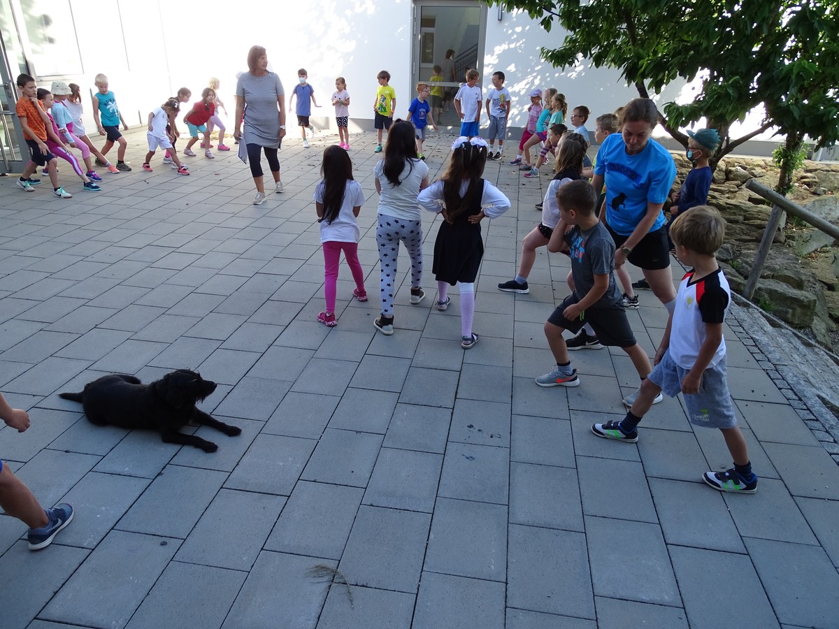 Welch eine Freude, als alle Kinder der Klassen 1 und 2 sich zum Aufwärmen versammelten, denn heute sollte ihr Tag werden. Waren auch die Trainingsergebnisse der zurückliegenden Wochen überschaubar, so wollte es sich niemand nehmen lassen, an den Start zu gehen. Die Aufgabe lautete: Laufe 15 Minuten oder 30 Minuten, ohne dazwischen anzuhalten. Einen rieseigen Motivationsschub bekamen die Schülerinnen und Schüler natürlich durch den Schulhund Akasha, der zusammen mit Frau Hausladen die Vorhut bildete und erstmal das Tempo vorgab. "Niemand überholt!", so lautete die Devise. Und wie groß war die Überraschung, als nach 30 gelaufenen Minuten die Kinder den Countdown zum Aufhören vernahmen. Mehr als dreiviertel aller Teilnehmer schafften die 30-Minuten-Vorgabe und niemand gab auf, bevor man die 15-Minuten-Zeitmarke passiert hatte. Die begeisterten Lehrerinnen, die die Rolle des Anfeuerns übernommen hatten, schauten in zahlreiche ungläubige Gesichter, denn so schnell war es nicht jedem klar, dass man das Ziel erreicht hatte. Als Anerkennung gab es nicht nur eine Urkunde, sondern an diesem Tag auch keine Hausaufgaben! Der Wettbewerb "Lauf dich fit" war für alle ein sportliches Highlight.