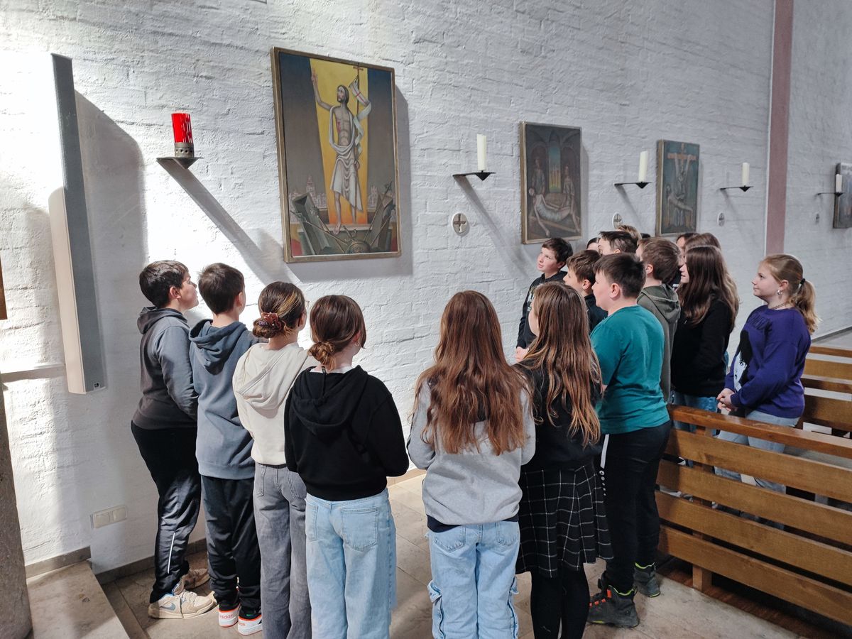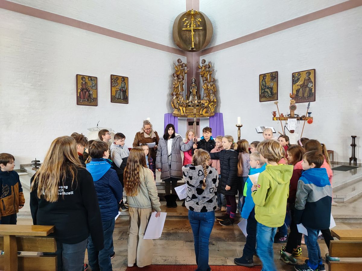 Um den Kindern der Grund- und Mittelschule die Passionsgeschichte näher zu bringen, luden die Gemeindereferentin Fr. Blatz und die Religionslehrerin Fr. Steger die Kinder der 3. und 4. Klasse sowie die Kinder der Klasse 6a in die Hl. Geist Kirche in Mittefels zur Gestaltung eines Kreuzwegs ein. Die beiden Lehrkräfte gaben den Kindern Hintergrundinformationen zum Leidensweg Jesu und luden anschließend die Kinder ein, diesen Weg als Erinnerung und als Vorbereitung auf das Osterfest selbst zu gehen. Mit Texten, Liedern und Gebeten zogen die Kinder anschließend durch die Kirche und konnten so eindrucksvoll die Passionsgeschichte erleben.