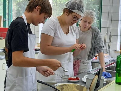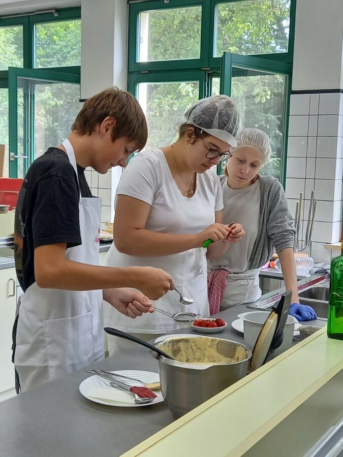 Einen informativen Vormittag verbrachten die Schülerinnen und Schüler der Klasse M7 zusammen mit ihren Fachlehrerinnen Fr. Bogenberger und Fr. Simmel am 22.06.2022 an der Berufsfachschule in Mitterfels. Nach einem kurzen Überblick über die drei Zweige der Marianne-Rosenbaum-Schule wurde in kleinen Gruppen, zusammen mit Schülerinnen und Schülern der Berufsfachschule, einiges ausprobiert und hergestellt. So durften wir in der großen Lehrküche Waffeln backen und die extra für uns selbstgebackenen Schildkrötensemmeln belegen. Frisch gestärkt ging es weiter zur Musikstunde in der Kinderpflege. Dort erhielten wir einen Einblick in die Arbeit im Kindergarten und wie dort gemeinsam Lieder erarbeitet werden. Schritt für Schritt erlernten so alle in kurzer Zeit einen Sprechgesang mit Bodypercussion. Bei der Sozialpflege konnte am eigenen Körper erfahren werden, wie es ist blind zu sein und sich um jemand zu kümmern, der selber nicht sehen kann. Gemeinsam musste eine knifflige Aufgabe in Teamarbeit bewältigt werden. Anhand eines Blindenalphabets konnten wir noch versuchen Buchstaben zu erfühlen. Zu guter Letzt bedankten wir uns für die tollen Angebote und Einblicke und gingen zurück zur Schule.